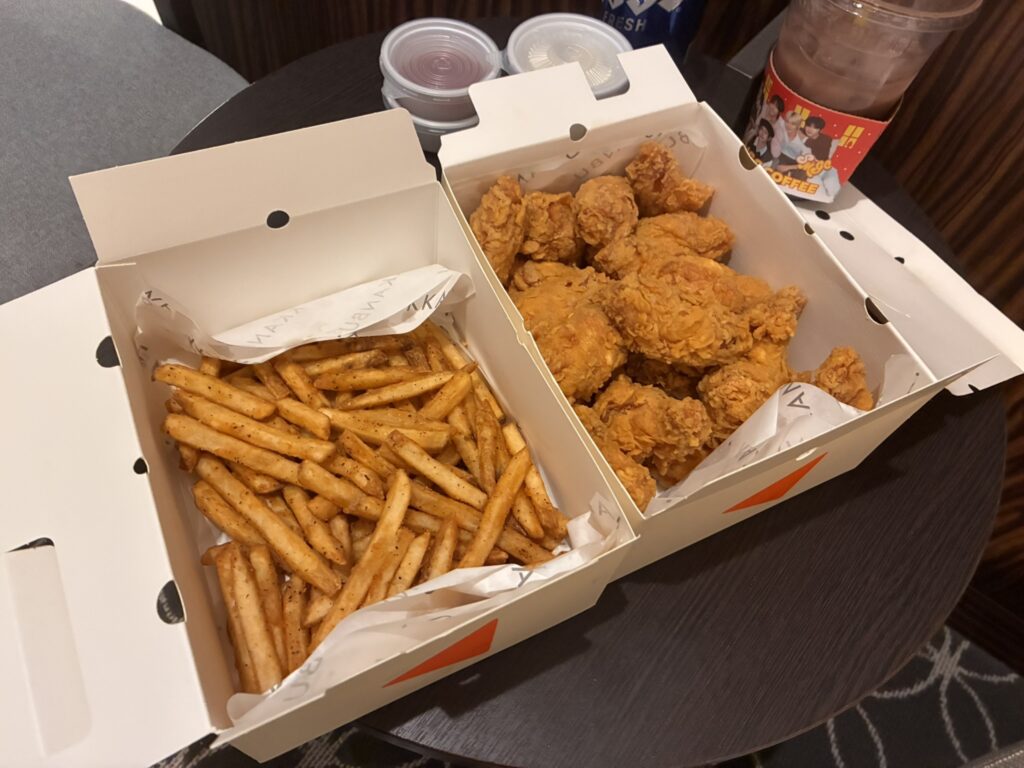 ホテル近くにある「カンブチキン」でチキンとポテトをテイクアウトして帰りました。