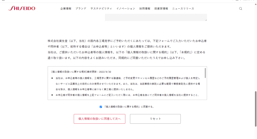 ・資生堂サイト内【Home>企業情報>工場見学>大阪茨木工場/西日本物流センター>工場見学のご予約】をクリック