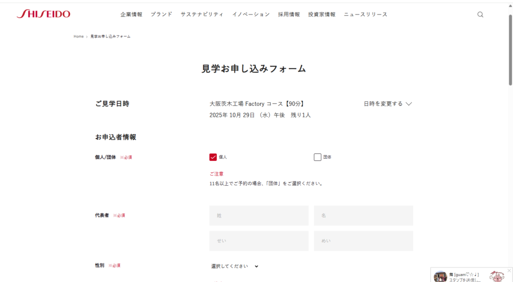 ・「資生堂 大阪茨木工場 見学予約」で検索