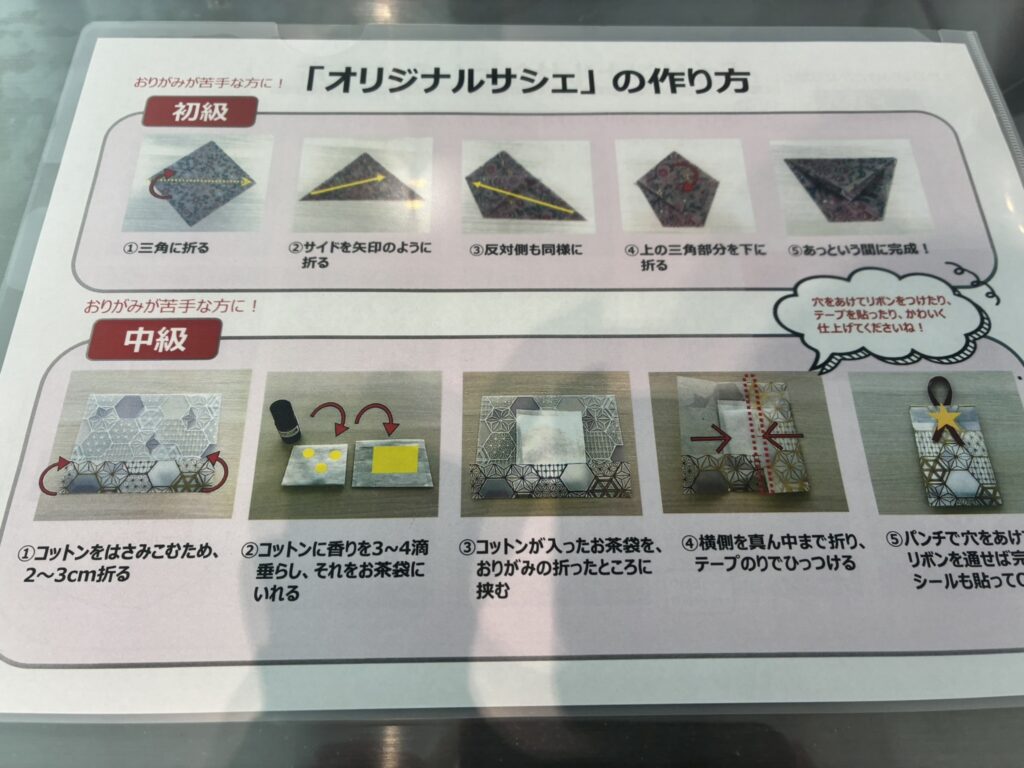 私が参加した際にはサシェ作りに変更されていました。